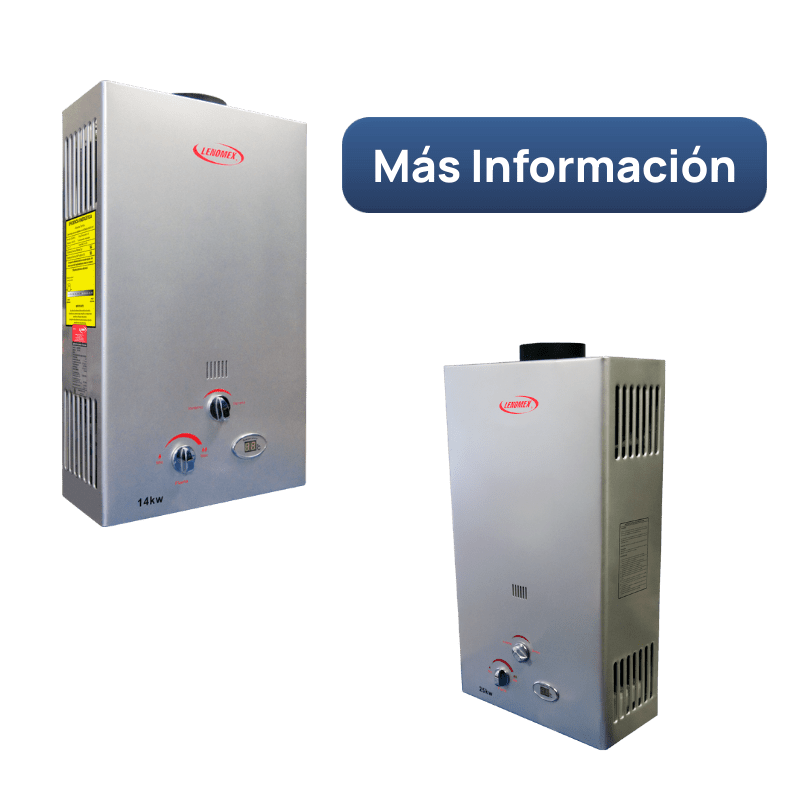 El calentador de agua instantáneo Lenomex modelo LID13 ofrece potencia superior para familias que requieren abastecimiento simultáneo de agua caliente en múltiples puntos. Disponible en dos versiones para adaptarse a su tipo de instalación: LID13 GAE para gas L.P. y LID13 GAN para gas natural, garantizando compatibilidad perfecta con su infraestructura existente.